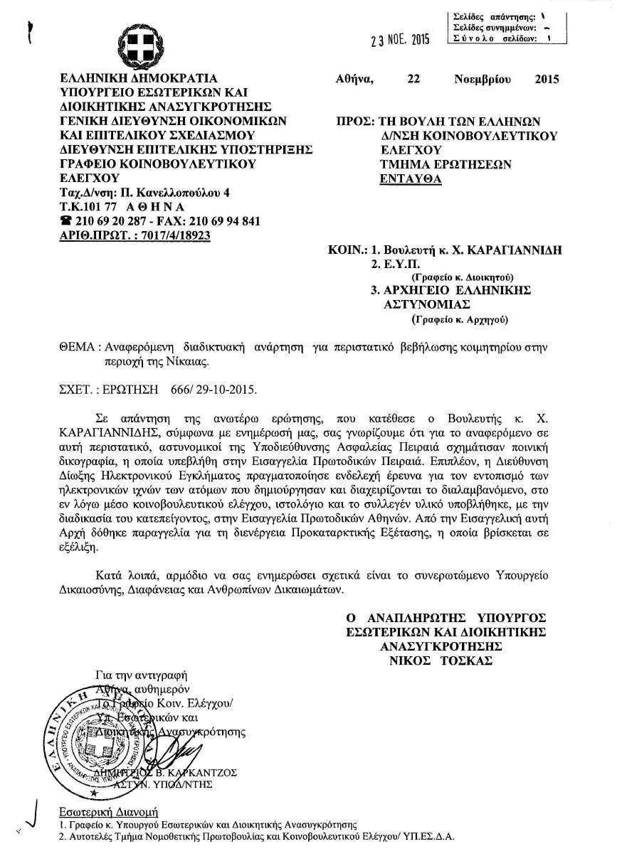Στις 29/10/2015 ο βουλευτής του ΣΥΡΙΖΑ Χρήστος Καραγιαννίδης κατέθεσε στη Βουλή σχετική ερώτηση, για την οποία οι αρμόδιοι υπουργοί Δικαιοσύνης και Δημόσιας Τάξης του απάντησαν αργότερα πως έχει σχηματιστεί δικογραφία στην Εισαγγελία Πρωτοδικών Αθήνας και εκείνη του Πειραιά.