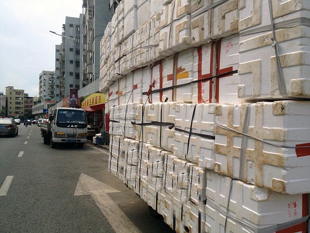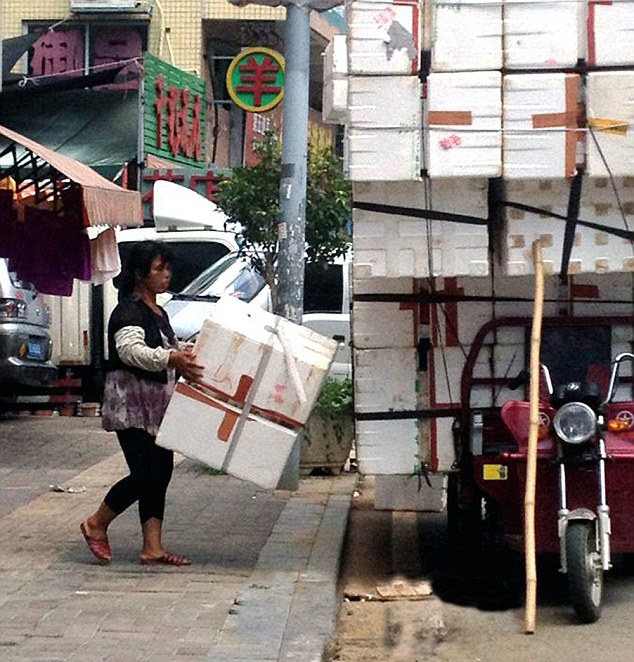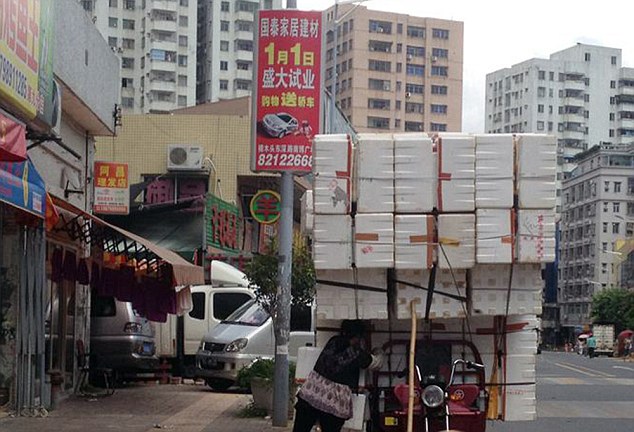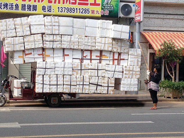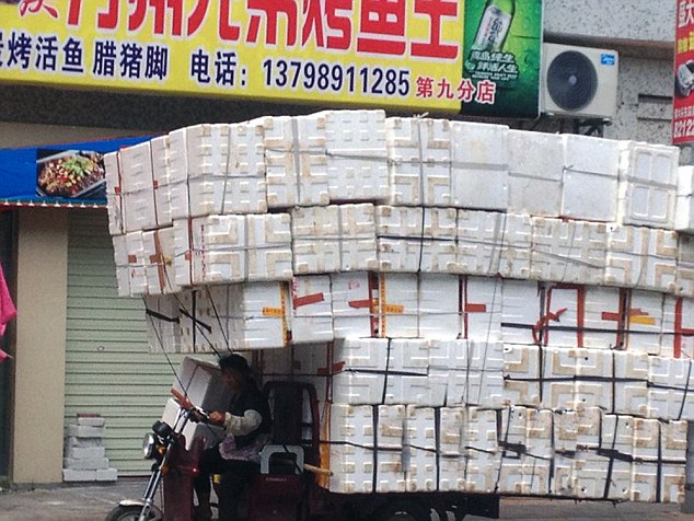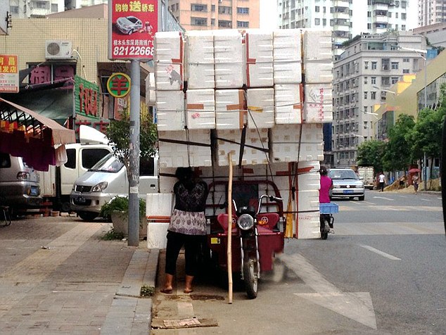 Pic shows: The overloaded tricycle with the boxes. A woman nearly caused a pile up by loading her tricycle with scores of empty cardboard boxes. Stunned motorists had to give her a wide birth as she fastened on the boxes in the city of Dongguan, south Chinas Guangdong Province. Witnesses said some 200 empty plastic boxes were tied to the tricycle, which would have been considered a serious traffic violation, had she been caught by police. The small tricycle looked like a lorry after the woman had finished her handiwork. Some passing motorists actually stopped to take photos while others took a wide berth in case the boxes came tumbling down onto their cars. Pictures of her laden down transport quickly went viral on Chinese social media. One called her the "snail woman" because she waould have to drive so slowly. Another asked : "What if the boxes collapse on her while shes riding the tricycle?" Someone else said:: "At least the boxes are empty." Another commented:"I hope it doesnt rain." (ends)