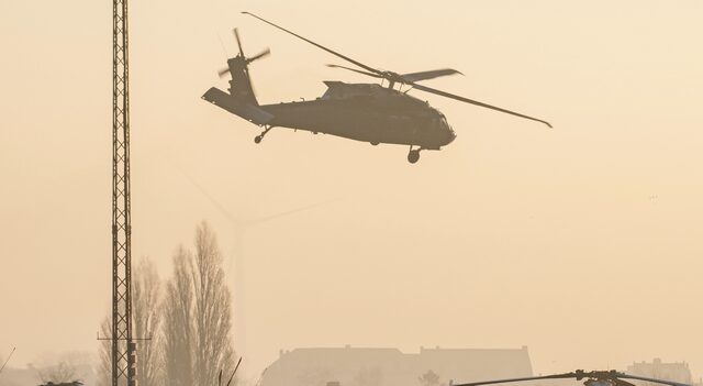 A US 'Black Hawk'' helicopter takes off for operation 'Atlantic Resolve' from a harbor pier in Bremerhaven, Germany, Tuesday, Feb. 14, 2017. The helicopters are among the military equipment that is to help strengthen the NATO eastern flank during the operation. ( Ingo Wagner/dpa via AP)