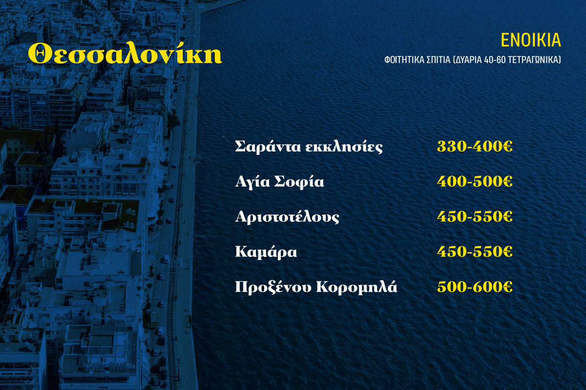 Στα 400-500 ευρώ κυμαίνονται οι τιμές για κατοικίες 40-60 τετραγωνικών στις περισσότερες φοιτητουπόλεις της χώρας με το ποσό να κρίνεται ιδιαίτερα υψηλό τη στιγμή που ένα δυάρι σπάνια να μπορεί να υποστηρίξει πάνω από ένα άτομο. Οι τιμές αυτές αν συνυπολογιστούν τα πάγια μηνιαία έξοδα ενός νοικοκυριού, σημαίνει πως ένας φοιτητής χρειάζεται περίπου 600 ευρώ τον μήνα προκειμένου να μπορεί να ανταποκριθεί στις βασικές στεγαστικές του ανάγκες. Αυτό, τη στιγμή που ο κατώτατος μισθός έχει οριστεί στα 713 ευρώ και που η πλειονότητα των νέων αδυνατεί να εργαστεί full time.