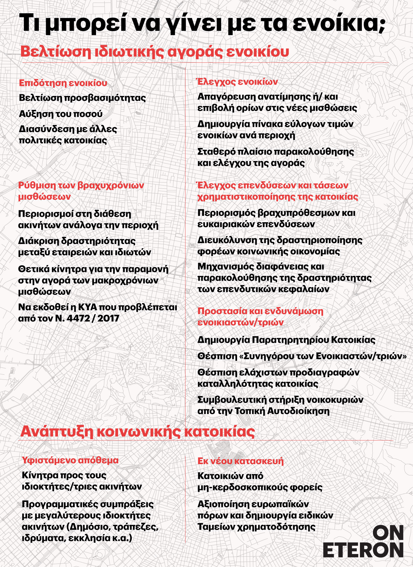 Από τη μεριά του, το Eteron κατέγραψε και αξιολόγησε κατευθύνσεις δημόσιας παρέμβασης και πολιτικής που θα πρέπει να συζητηθούν και να εφαρμοστούν στο ελληνικό πλαίσιο ως μέρος μιας ευρύτερης στεγαστικής στρατηγικής. Οι προτεινόμενες παρεμβάσεις έχουν διαφορετικό χρονικό πλαίσιο εφαρμογής, αλλά λειτουργούν συμπληρωματικά ως ένα ενιαίο πλέγμα με στόχο τη σταδιακή διαμόρφωση ενός ολοκληρωμένου θεσμικού πλαισίου, μηχανισμών και εργαλείων πολιτικής για τη διασφάλιση οικονομικά προσιτής και ασφαλούς/σταθερής ενοικιαζόμενης κατοικίας στην Ελλάδα.