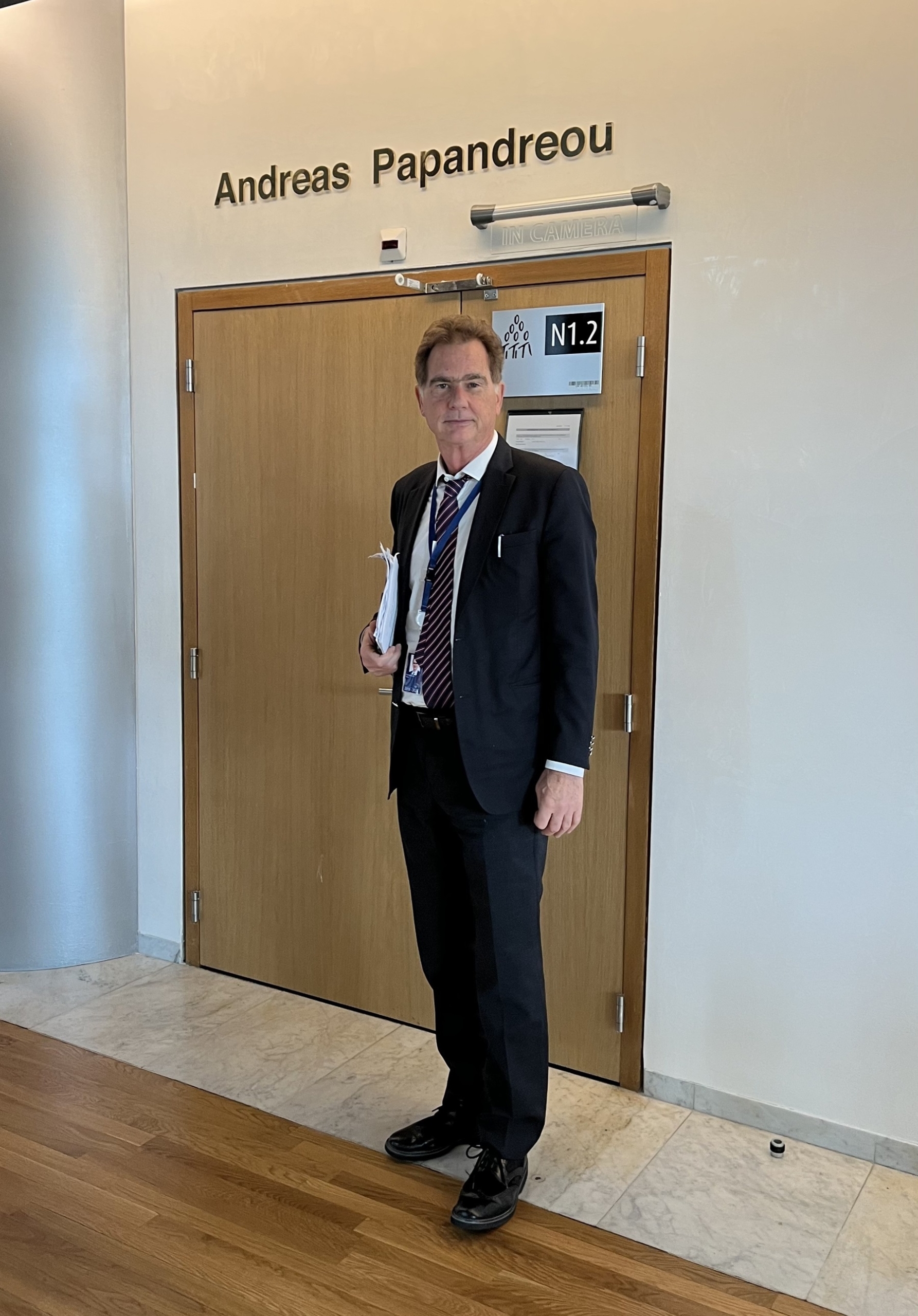 Ο Νίκος Παπανδρέου, ο μοναδικός Ευρωβουλευτής του ΠΑΣΟΚ ήταν αυτό το μέλος αλλά το πραγματικά ενδιαφέρον ήταν αλλού -μέχρι τουλάχιστον να αρχίσουμε την κουβέντα μας- και κρυβόταν μέσα σε μια περίεργη σύμπτωση. Αυτό το μπαρ βρισκόταν απέναντι από μία αίθουσα που έφερε τιμητικά το όνομα “ANDREAS PAPANDREOU” και επομένως, και κυριολεκτικά και μεταφορικά, αυτή η συζήτηση θα γινόταν τρόπον τινά στη σκιά αυτής της πόρτας.
