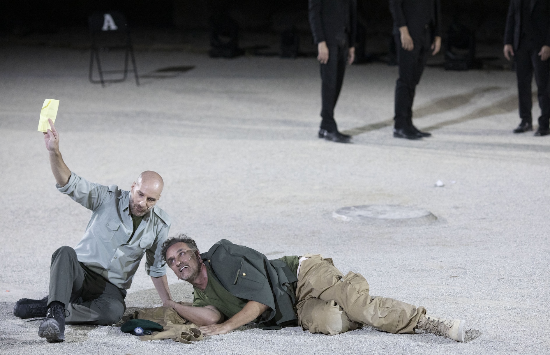 Μας είχε “προειδοποιήσει” και στη συνέντευξη που είχε παραχωρήσει στο NEWS 24/7 και στη συνέντευξη Τύπου που είχε δώσει πως “στο κέντρο όλων βρίσκεται ο Πόλεμος”. Και όντως η ατμόσφαιρα της παράστασης ήταν καθαρόαιμα πολεμική και απόκοσμα απειλητική. Οι κατακόρυφοι φωτισμοί του Oskars Paunins που ένιωθες πως πήγαζαν μέσα από τα σπλάχνα ενός πολεμικού στρατοπέδου, η χωμάτινη ορχήστρα με τους μαύρους όγκους που σιγά σιγά ξετυλίγονταν αποκαλύπτοντας τα χρώματά τους. Και τελικά το “γελοίον” του πολέμου.