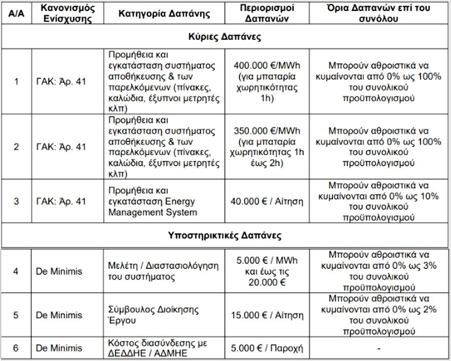 Όπως φαίνεται από τον παραπάνω πίνακα, η επιλέξιμη δαπάνη για μπαταρίες με χωρητικότητα μίας ώρας δεν μπορεί να υπερβαίνει τις 400.000 €/ MWh και για μπαταρίες με χωρητικότητα μεταξύ μίας και δύο ωρών δεν μπορεί να υπερβαίνει τις 350.000 €/ MWh.