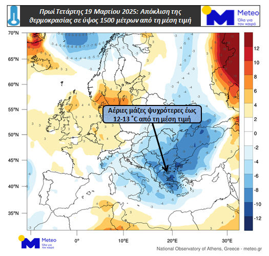 Στην παρακάτω παρουσιάζεται η απόκλιση της θερμοκρασίας σε ύψος 1500 μέτρων* από τη μέση τιμή της περιόδου 1979-2010. Σε αυτή φαίνεται ότι το πρωί της Τετάρτης 19/03 η θερμοκρασία σε ύψος 1500 μέτρων θα είναι έως και 12-13 ˚C χαμηλότερη της μέση τιμής.