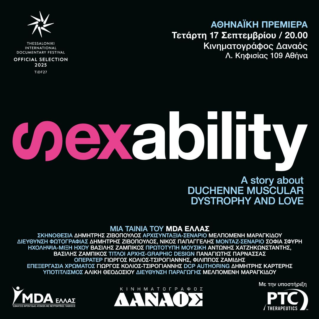 Tον έρωτα, το σεξ και την αναπηρία πραγματεύεται το ντοκιμαντέρ του MDA Ελλάς “Sexability – A story about Duchenne Muscular Dystrophy and Love”, το οποίο μετά την επιτυχημένη πρεμιέρα στο Φεστιβάλ Ντοκιμαντέρ Θεσσαλονίκης, στο τμήμα “Ανοιχτοί Ορίζοντες”, έρχεται στην Αθήνα για μία μοναδική προβολή, σήμερα Τετάρτη 17 Σεπτεμβρίου, στον Κινηματογράφο Δαναό στις 20.00.