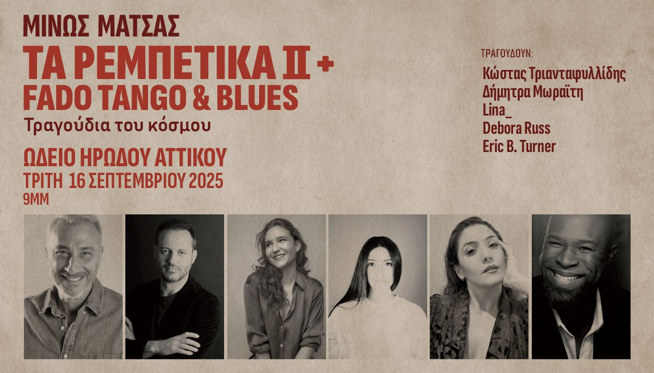 Μετά την περσινή sold out εμφάνιση στο Ηρώδειο, ο Μίνως Μάτσας επιστρέφει την Τρίτη 16 Σεπτεμβρίου στο Ηρώδειο με τον δεύτερο κύκλο του μουσικού ταξιδιού Ρεμπέτικα II + Fado, Tango & Blues.
