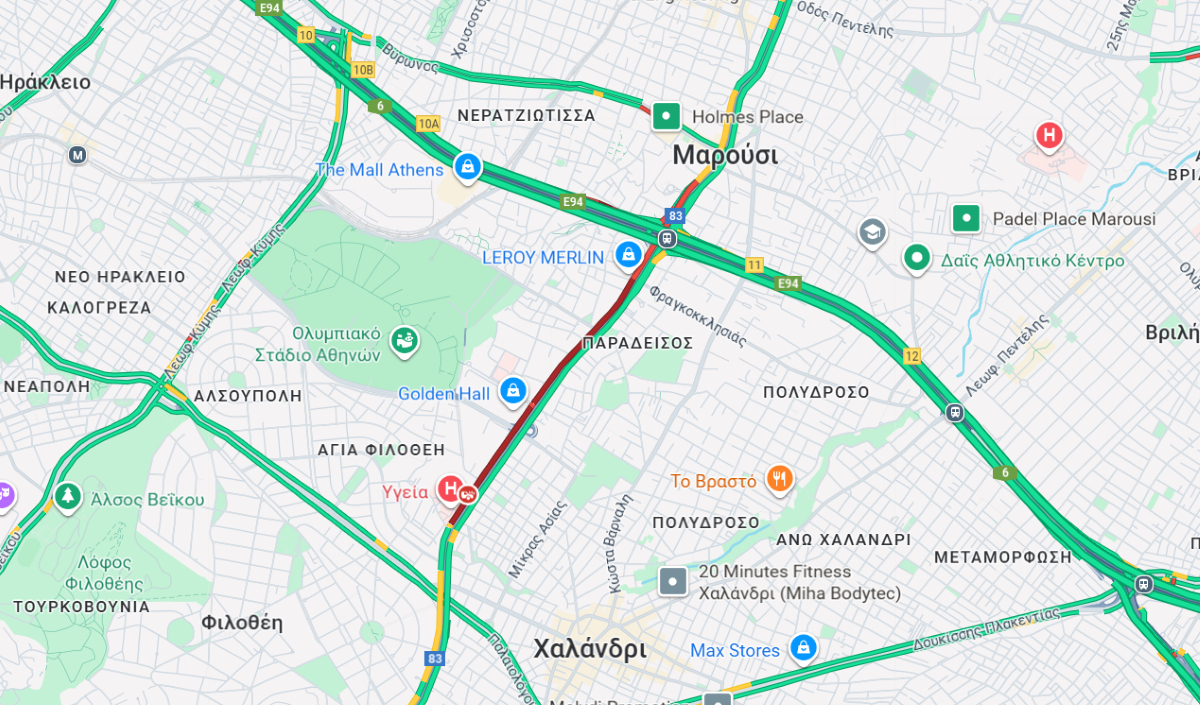 Συγκεκριμένα, το τροχαίο σημειώθηκε στο ύψος της οδού Ερυθρού Σταυρού, στο Μαρούσι, ενώ όπως φαίνεται και στον χάρτη το ρεύμα της καθόδου είναι στο “κόκκινο”.