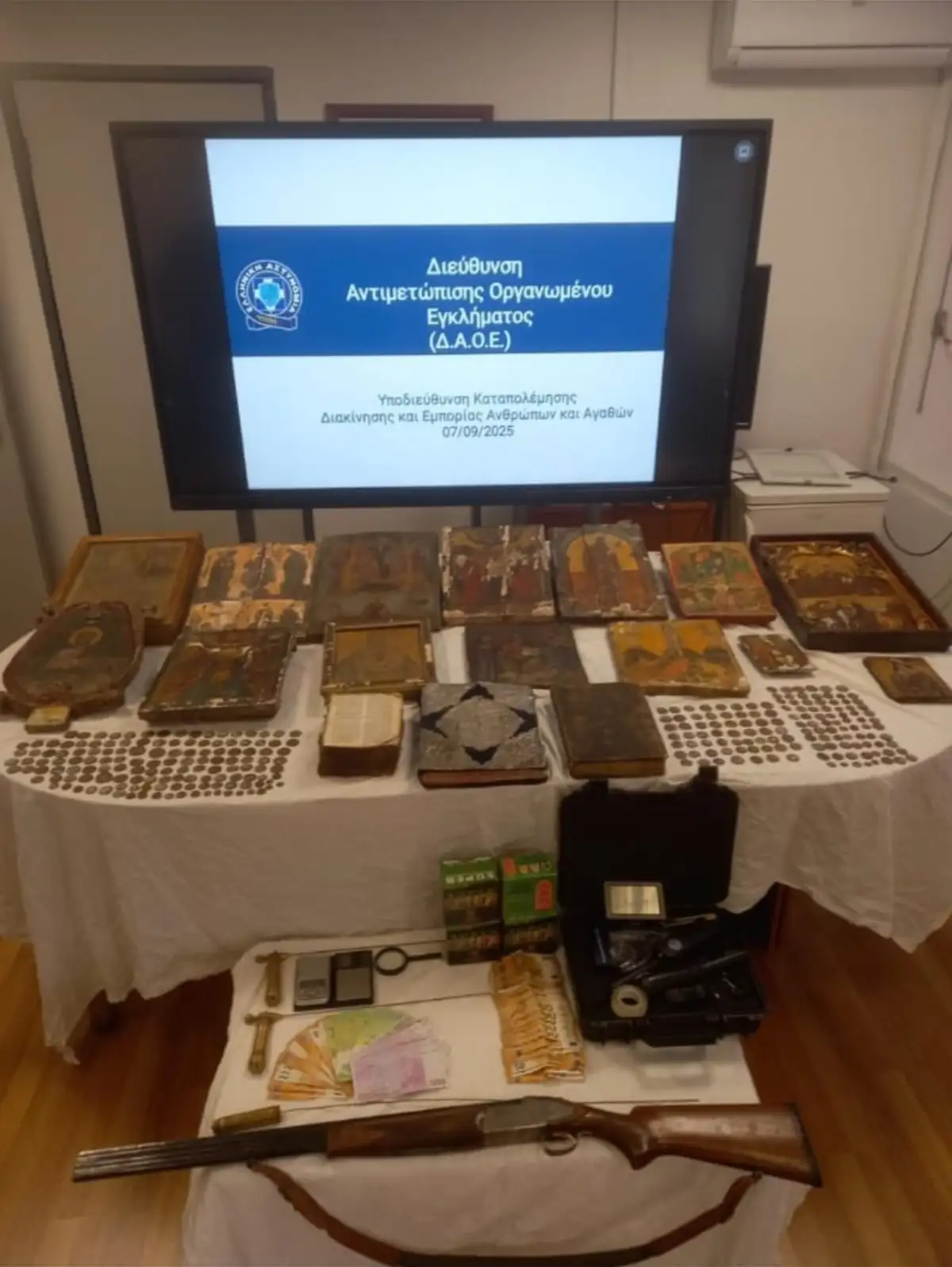 Η ΕΛ.ΑΣ. έδωσε στη δημοσιότητα και φωτογραφίες κειμηλίων που ετοιμάζονταν να πουλήσουν οι εμπλεκόμενοι, ανάμεσά τους δύο ιερά ευαγγέλια του 1737 και του 1761 και 17 βυζαντινές εικόνες.