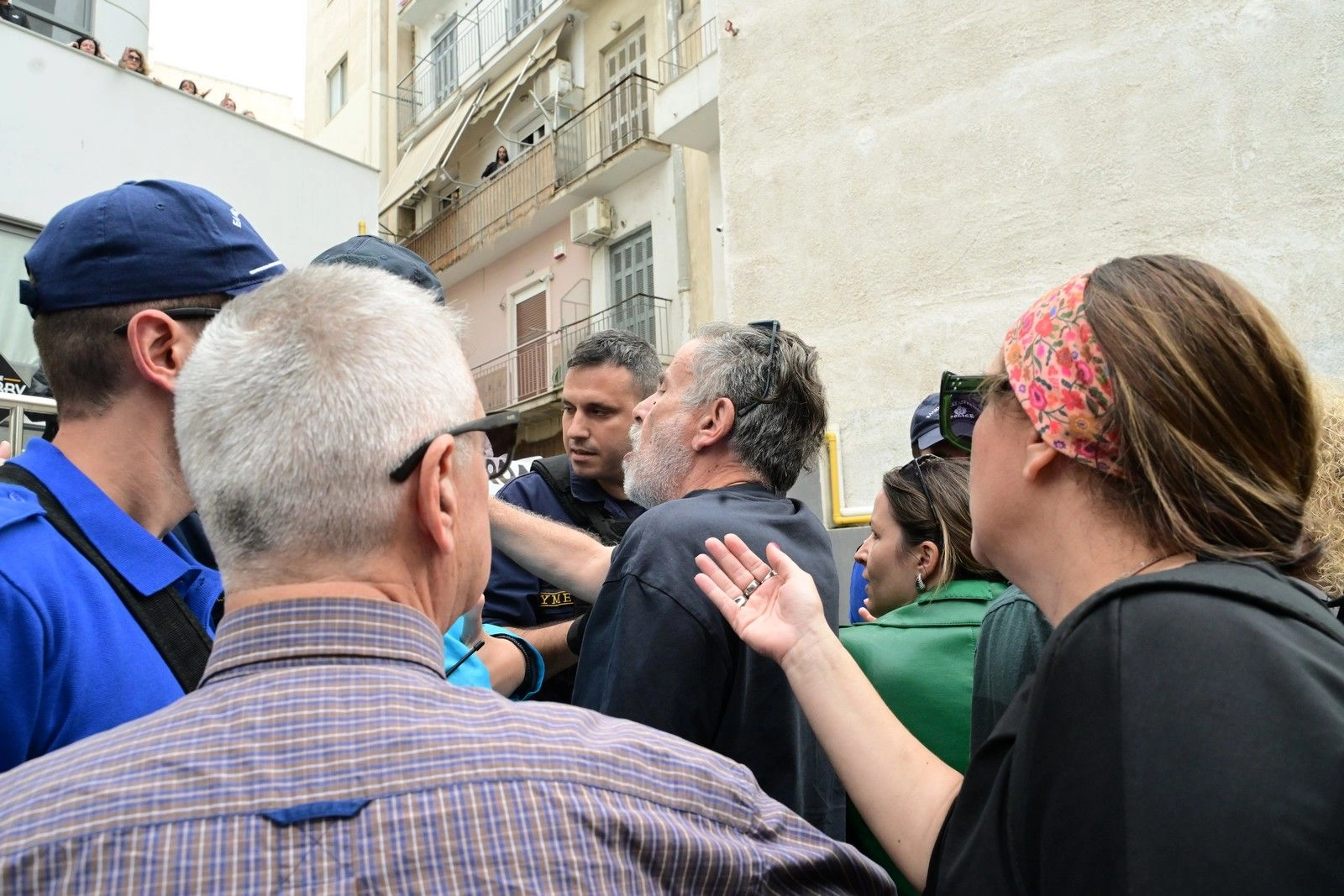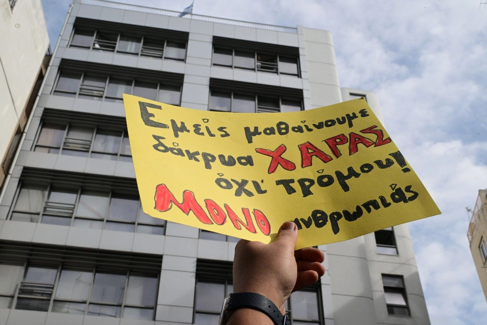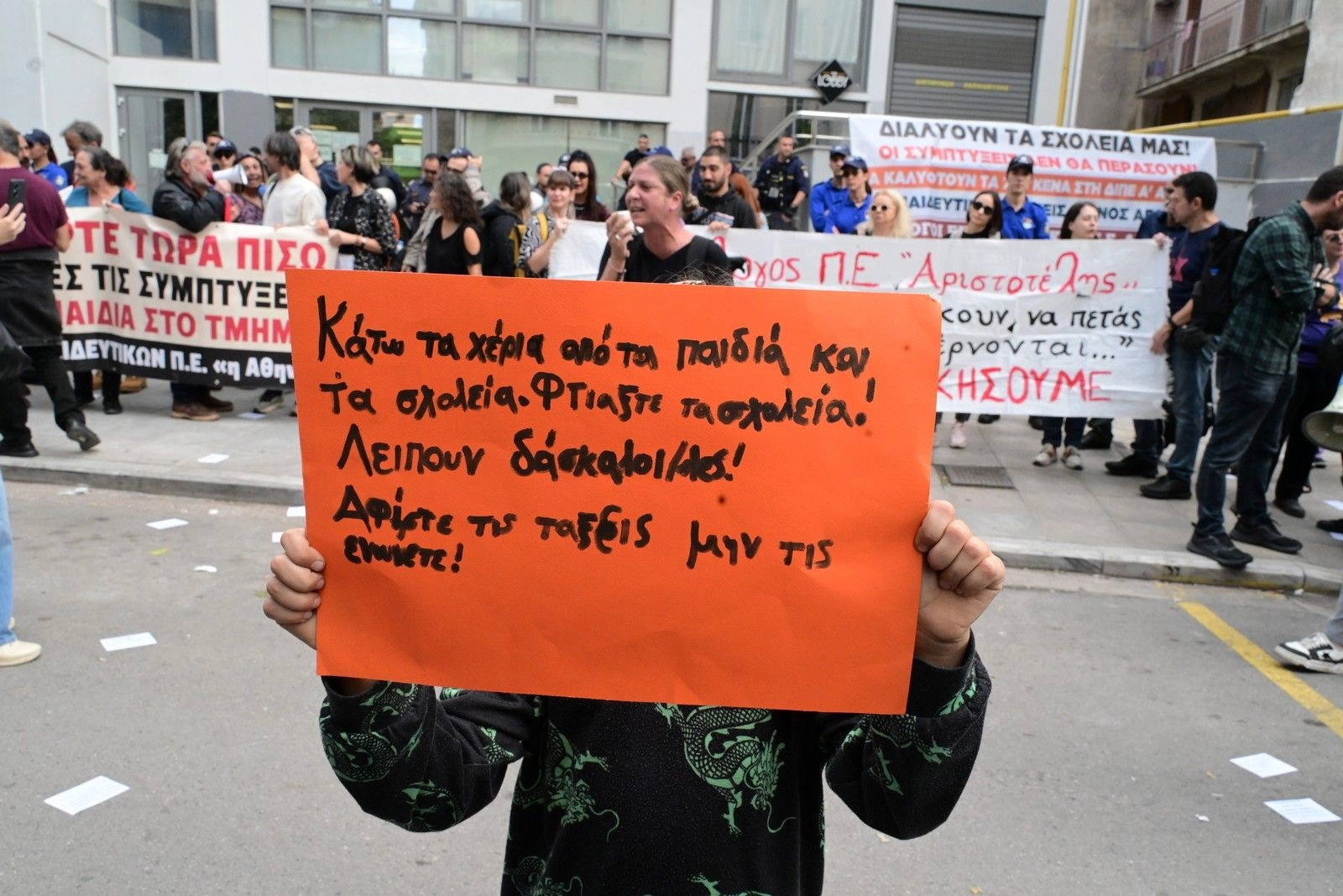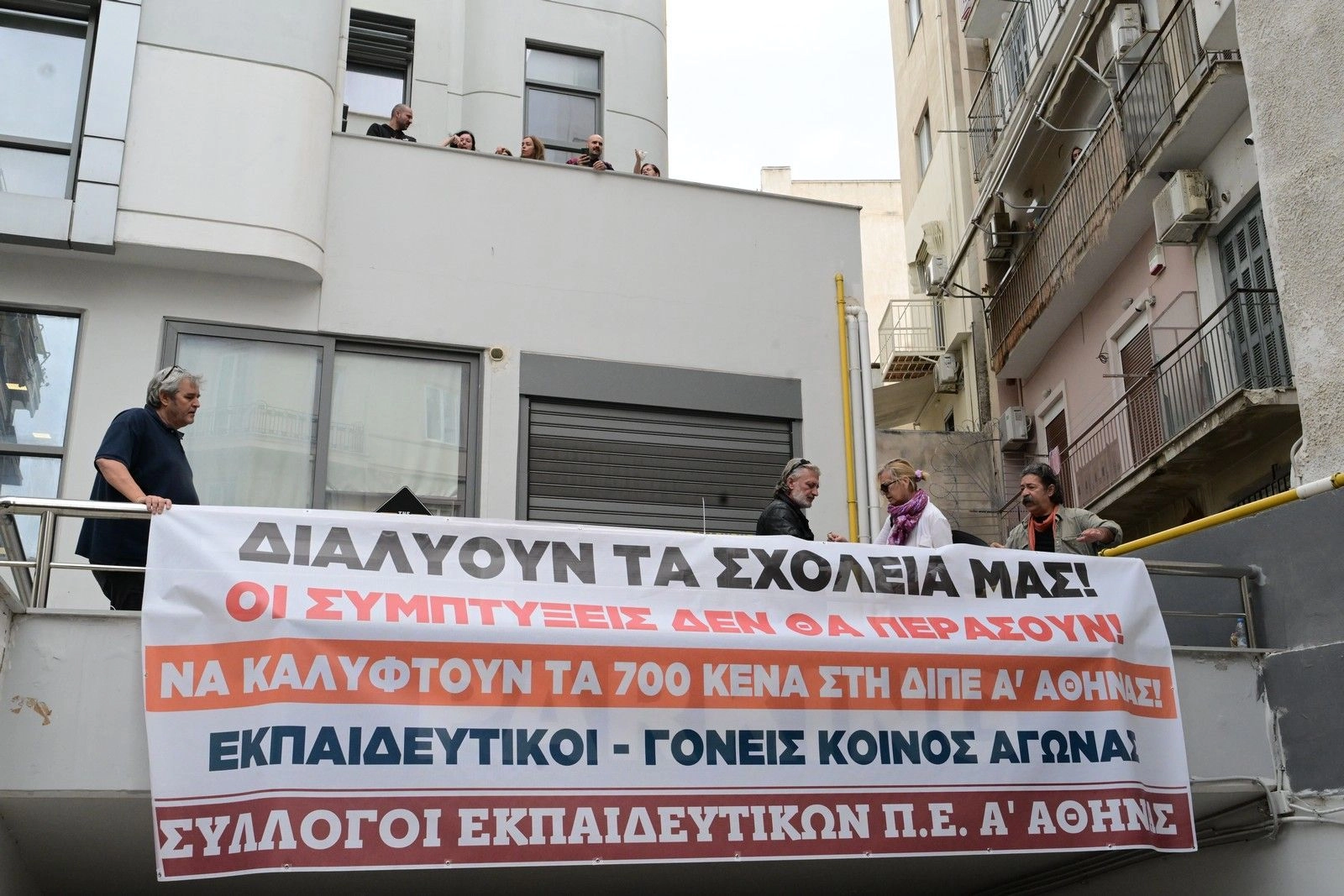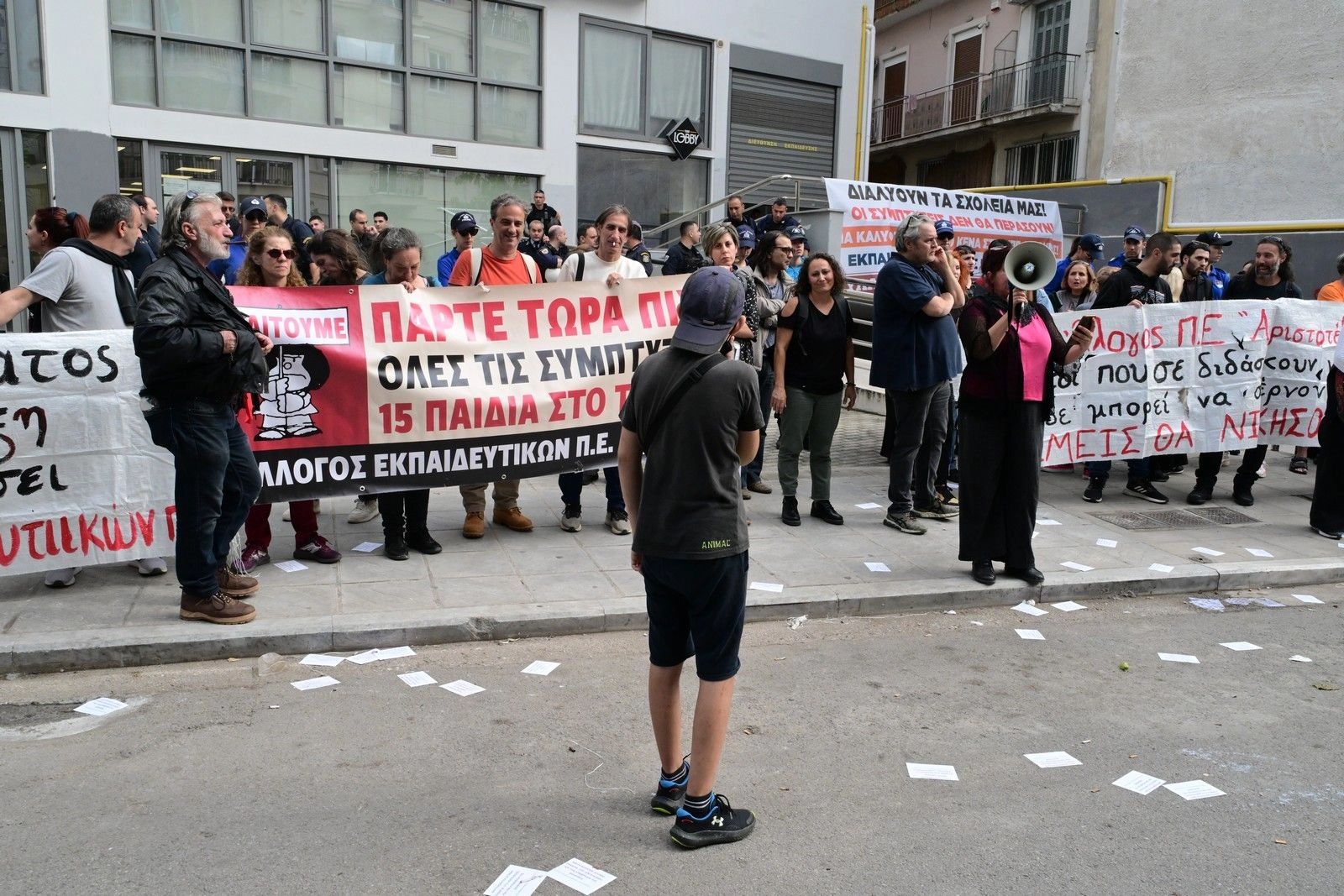 Οι εκπαιδευτικοί πραγματοποιούν συγκέντρωση έξω από τη Διεύθυνση Πρωτοβάθμιας Εκπαίδευσης στο Μεταξουργείο, και ζητούν να σταματήσουν οι συγχωνεύσεις τμημάτων.