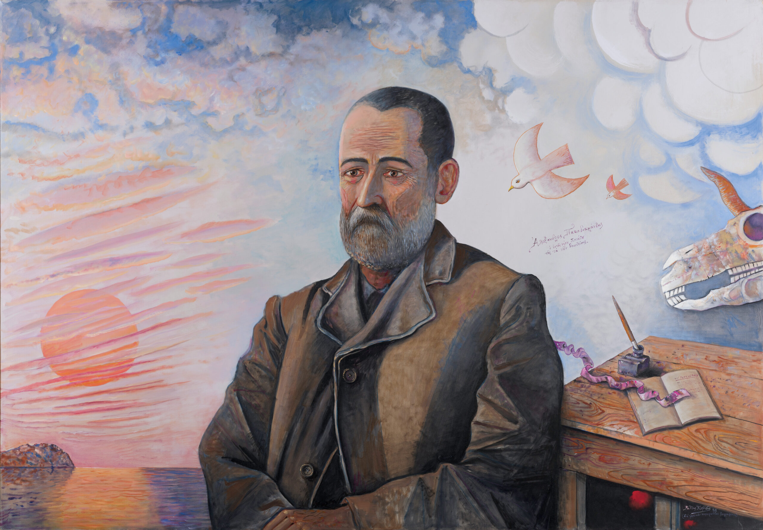 “Ανάερα κρεμασμένος σαν πολυέλαιος της εκκλησιάς, με την παλέτα και το πινέλο στα χέρια, σαν τα λιοντάρια που σε κοιτάζουν ανθρώπινα μέσα από τα παλιά περσικά χαλιά, ποτέ δεν είδα αυτόν τον άνθρωπο χωρίς να σκίρτησει η καρδιά μου. Βλέπεις χιλιάδες ανθρώπους και λες νεκροταφείο κινούμενο είναι ο δρόμος, όλοι τούτοι πέθαναν ή θα πεθάνουν. Σαν τα πρόβατα, σαν τις όρνιθες καταχτυπούν μία στιγμή στις σκόνες και τα πεζοδρόμια και ύστερα θα χαθούν. Σαν να μην υπήρξαν ποτέ τους.