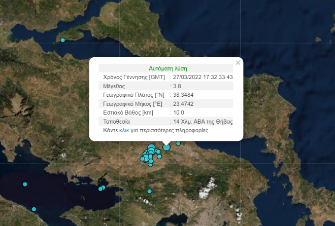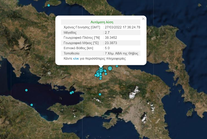 Μάλιστα, 4 λεπτά αργότερα σημειώθηκε νέα σεισμική δόνηση, μεγέθους 2,7 βαθμών της κλίμακας Ρίχτερ, με το επίκεντρο να εντοπίζεται 7 χλμ. ανατολικά βορειοανατολικά της Θήβας και το εστιακό βάθος να είναι στα 5 χλμ.