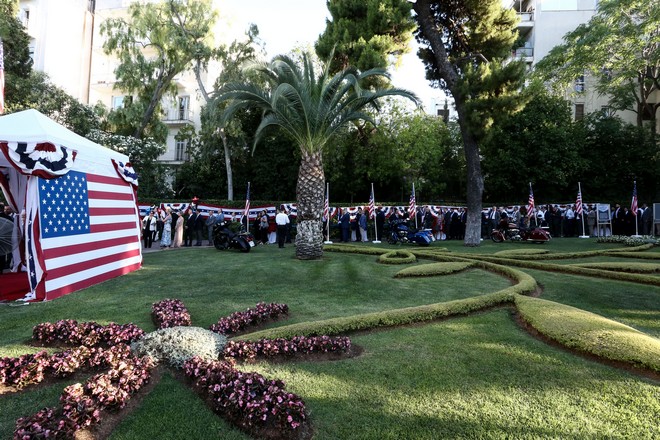 Στον κήπο του αμερικανικής πρεσβευτικής κατοικίας, που ήταν διακοσμημένος στα χρώματα της «αστερόεσσας» (κόκκινο, λευκό, μπλε), οι καλεσμένοι είχαν την ευκαιρία να γευτούν νόστιμα εδέσματα, υπό τους ήχους της μουσικής από την Ανωτάτη Στρατιωτική Διοίκηση Υποστήριξης Στρατού.
