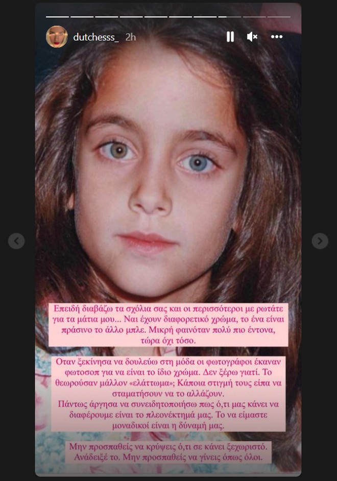 “Επειδή διαβάζω τα σχόλιά σας και οι περισσότεροι με ρωτάτε για τα μάτια μου, ναι έχουν διαφορετικό χρώμα το ένα είναι πράσινο το άλλο μπλε… μικρή φαινόταν πολύ πιο έντονα τώρα όχι τόσο. Όταν ξεκίνησα να δουλεύω στη μόδα οι φωτογράφοι έκαναν photoshop για να είναι το ίδιο χρώμα δεν ξέρω γιατί το θεωρούσαν μάλλον “ελάττωμα”; Κάποια στιγμή τους είπα να σταματήσουν να το αλλάζουν. Πάντως άργησα να συνειδητοποιήσω πως ό,τι μας κάνει να διαφέρουμε είναι το πλεονέκτημα μας. Το να είμαστε μοναδικοί είναι η δύναμή μας, μην προσπαθείς να κρύψεις ότι σε κάνει ξεχωριστό ανάδειξε το μην προσπαθείς να γίνεις όπως όλοι”.