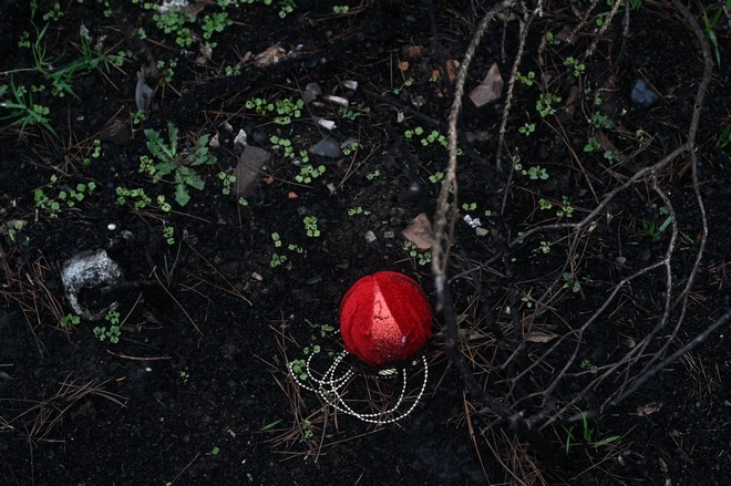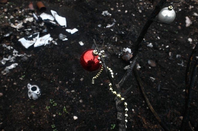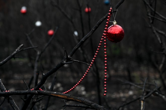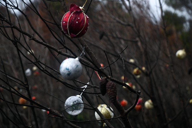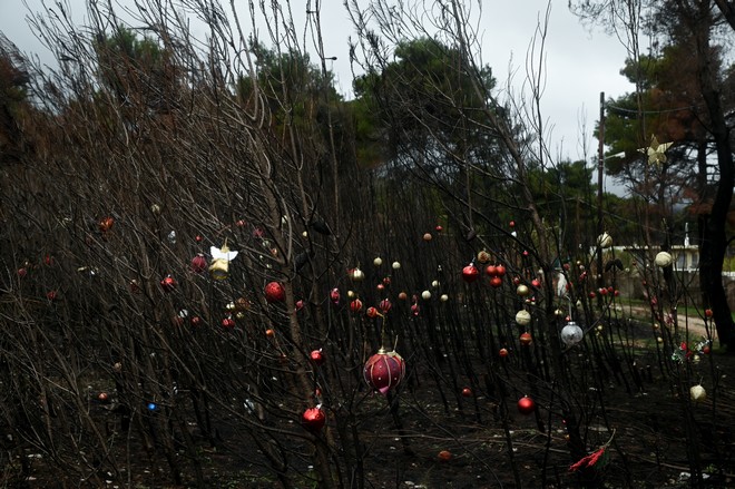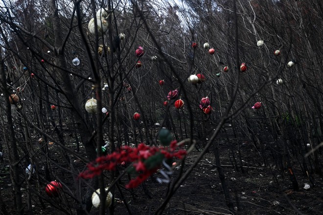 Χρυσά, ασημένια και κόκκινα στολίδια κρεμάστηκαν στα καμμένα κλαδιά των δέντρων της Βαρυμπόμπης.