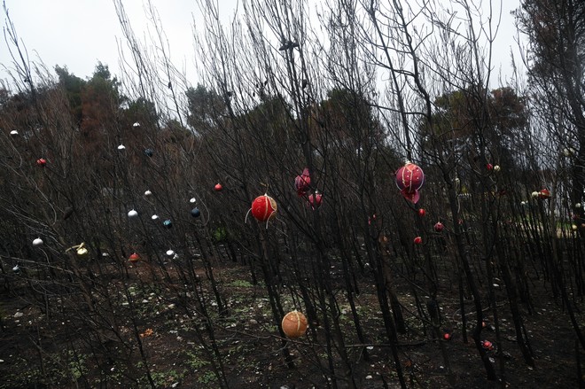 Σχεδόν τέσσερις μήνες μετά την καταστροφική πυρκαγιά οι κάτοικοι αποφάσισαν να δώσουν κατά κάποιο τρόπο ξανά ζωή στο δάσος τους. Τα κλαδιά των δέντρων γέμισαν με χρυσά, ασημένια και κόκκινα στολίδια.