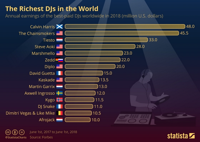 Ο Calvin Harris κατέκτησε και φέτος για έκτη συνεχή χρονιά την κορυφή της λίστας των πιο ακριβοπληρωμένων και πλούσιων DJs του Forbes, καθώς τα κομμάτια του και οι συνεργασίες του με ονόματα όπως η Ariana Grande και η Rihanna του απέφεραν κέρδη 48 εκατομμυρίων δολαρίων από τον Ιούνιο του 2017 μέχρι τον Ιούνιο του 2018.
