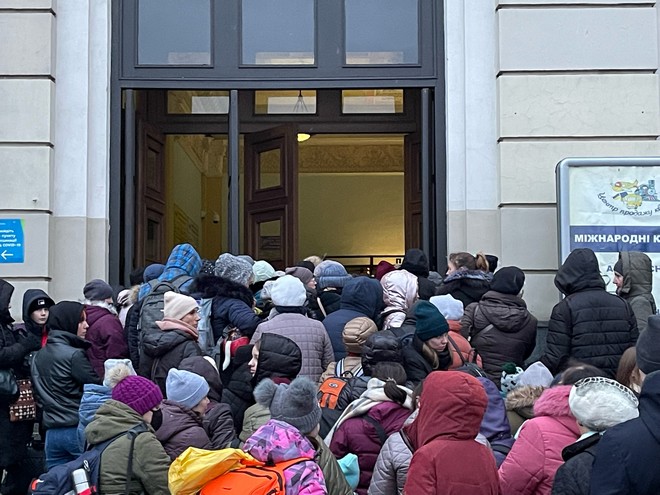 Οι ουρές που δημιουργούνται στην υπόγεια διάβαση, στον χώρο υποδοχής και έξω από την είσοδο του σιδηροδρομικού σταθμού του Λβιβ της Ουκρανίας, είναι το τελευταίο εμπόδιο των αμάχων πριν την φυγή τους από τη χώρα. Σε αυτόν τον σιδηροδρομικό σταθμό σταματούν τα τρένα από τα βάθη της εμπόλεμης χώρας. Όσοι αποβιβάζονται έχουν συνήθως τρεις επιλογές: Είτε να μείνουν σε κάποια από τα ξενοδοχεία της πόλης -τα οποία πάντως στην συντριπτική τους πλειοψηφία έχουν πλέον γεμίσει- είτε να ψάξουν κάποιο δρομολόγιο λεωφορείου προς τα σύνορα με Πολωνία ή με Ρουμανία, είτε να προσπαθήσουν να μπουν στο πρώτο διαθέσιμο τρένο προς το Πρσέμισλ της Πολωνίας.