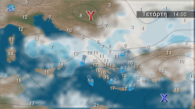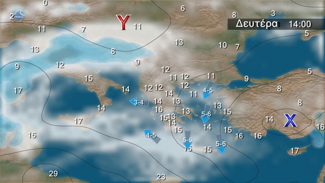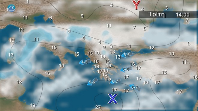 Στα δυτικά νεφώσεις παροδικά αυξημένες με σποραδικές βροχές και βαθμιαία βελτίωση. Στις υπόλοιπες περιοχές νεφώσεις κατά τόπους αυξημένες με τοπικές βροχές και πιθανώς στα θαλάσσια και παραθαλάσσια μεμονωμένες καταιγίδες. Τοπικές χιονοπτώσεις θα σημειωθούν στα ηπειρωτικά ορεινά. Οι άνεμοι θα πνέουν από ανατολικές διευθύνσεις 4 με 5 και στα νότια 6 με 7 μποφόρ. Η θερμοκρασία δεν θα σημειώσει αξιόλογη μεταβολή.