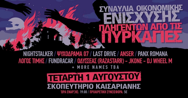 Διοργανώνουμε μία μεγάλη συναυλία, με την αφιλοκερδή συμμετοχή γνωστών μουσικών της ελληνικής hip hop – rock – εναλλακτικής μουσικής σκηνής, καλών φίλων, κάποιοι εκ των οποίων έχουν και οι ίδιοι (ή συγγενικά τους πρόσωπα) πληγεί από τις πρόσφατες φονικές πυρκαγιές.