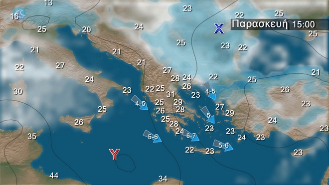 Γενικά αίθριος καιρός. Τοπικές νεφώσεις στα βόρεια ηπειρωτικά τις μεσημβρινές και απογευματινές ώρες, οπότε και θα εκδηλωθούν πρόσκαιροι όμβροι ή μεμονωμένες καταιγίδες στα βορειοανατολικά. Οι άνεμοι θα πνέουν δυτικοί βορειοδυτικοί 3 με 5 και στα νότια 6 με 7 μποφόρ. Η θερμοκρασία θα σημειώσει νέα άνοδο.