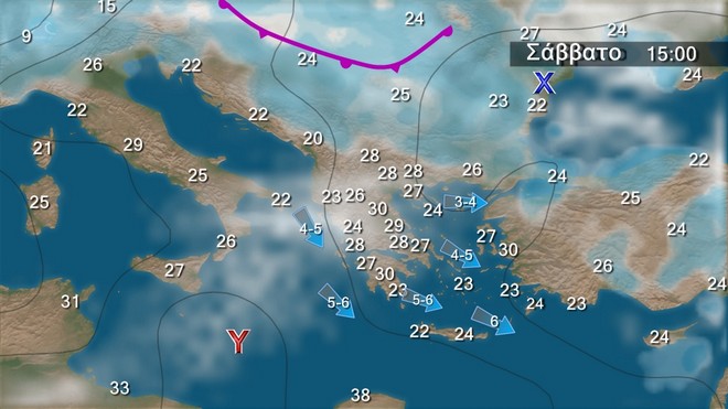 • Οι άνεμοι θα φτάνουν τα 4-5 και στα νότια τοπικά τα 5-6 και πιθανόν τα 6-7 μποφόρ