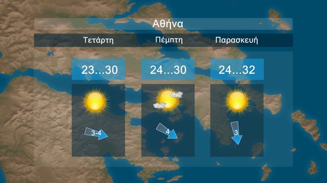 Με σχεδόν αίθριο καιρό θα κυλήσει το επόμενο τριήμερο στην Αθήνα. Οι άνεμοι θα πνέουν από δυτικές διευθύνσεις έως 4 μποφόρ και η θερμοκρασία θα έχει μέγιστες τιμές περί τους 30 με 32 βαθμούς Κελσίου.