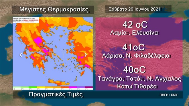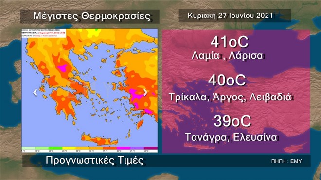 Κορύφωση της ζέστης είχαμε το Σάββατο (26/6) σε όλη τη χώρα με τις υψηλότερες τιμές της τάξεως των 40 βαθμών Κελσίου και πάνω να σημειώνονται κυρίως στα κεντρικά και νότια ηπειρωτικά.