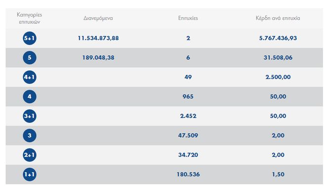 Δύο τυχερούς στην πρώτη κατηγορία (5+1 επιτυχίες) ανέδειξε η κλήρωση του τζόκερ την Πέμπτη (04/06), στην οποία διανέμονταν 11,5 εκατ. ευρώ.