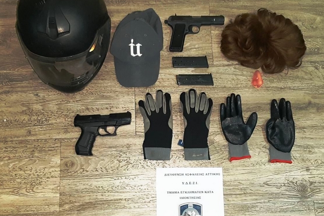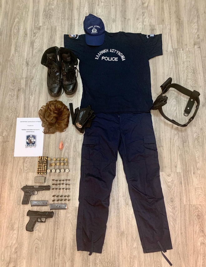 Στο αυτοκίνητο που χρησιμοποιούσαν καθώς και από τις κατ’ οίκον έρευνες, βρέθηκαν και κατασχέθηκαν πιστόλι και πιστόλι-ρέπλικα, πλήθος φυσιγγίων, διάφορα είδη μεταμφίεσης (περούκα, μύτη σιλικόνης), διάφορα είδη ένδυσης (ρούχα, καπέλα, γυαλιά ηλίου, γάντια), στολή αστυνομικού, καθώς επίσης σφυράκι θραύσης τζαμιών, κράνος μηχανής, κινητά τηλέφωνα και 150 ευρώ.