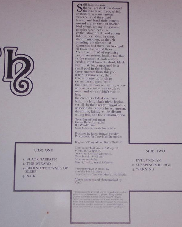 Το ποίημα δεν είχε credits αλλά φημολογείται πως το έγραψε ο μπασίστας της μπάντας, Geezer Butler. Το ποίημα ήταν τυπωμένο σε έναν ανάποδο σταυρό. Παρότι πολλοί θεώρησαν ότι οι στίχοι μιλούσαν για “σκοτεινούς δαίμονες” και έβλεπαν “σατανιστικά στοιχεία”, οι στίχοι συνδέονται περισσότερο με την έννοια της εξάρτησης και ναρκωτικές ουσίες.