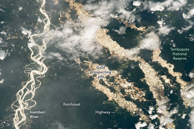 Οι λάκκοι, όπου οι ανθρακωρύχοι αναζητούν χρυσό, εμφανίζονται στις εικόνες ως εκατοντάδες λεκάνες γεμάτες νερό, περιτριγυρισμένες από λάσπη από τις οποίες έχει αφαιρεθεί η βλάστηση, εξηγεί η NASA.