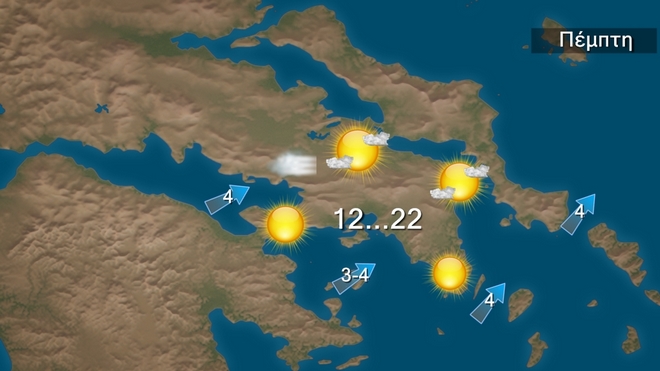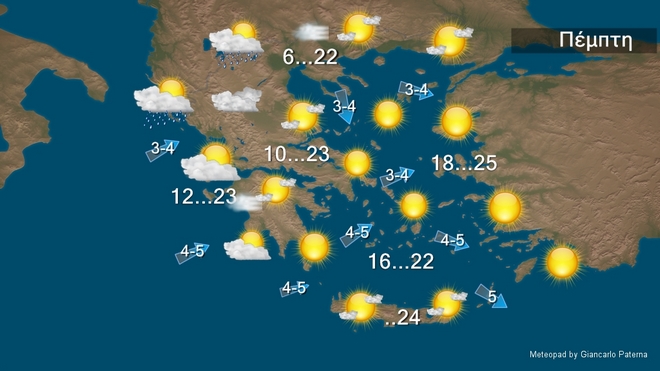 Η θερμοκρασία θα σημειώσει μικρή άνοδο. και θα φτάσει στα βόρεια τους 22 βαθμούς και στα υπόλοιπα τους 23 με 25 βαθμούς Κελσίου.