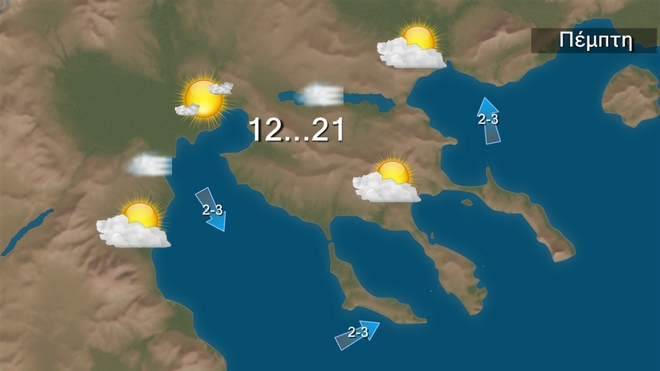 Σήμερα Πέμπτη σε όλη τη χώρα προβλέπεται γενικά αίθριος καιρός. Από το βράδυ στα βορειοδυτικά θα σημειωθούν τοπικές βροχές. Η ορατότητα τις πρωινές και τις βραδινές ώρες θα είναι κατά τόπους περιορισμένη και στα ηπειρωτικά θα σχηματιστούν ομίχλες.