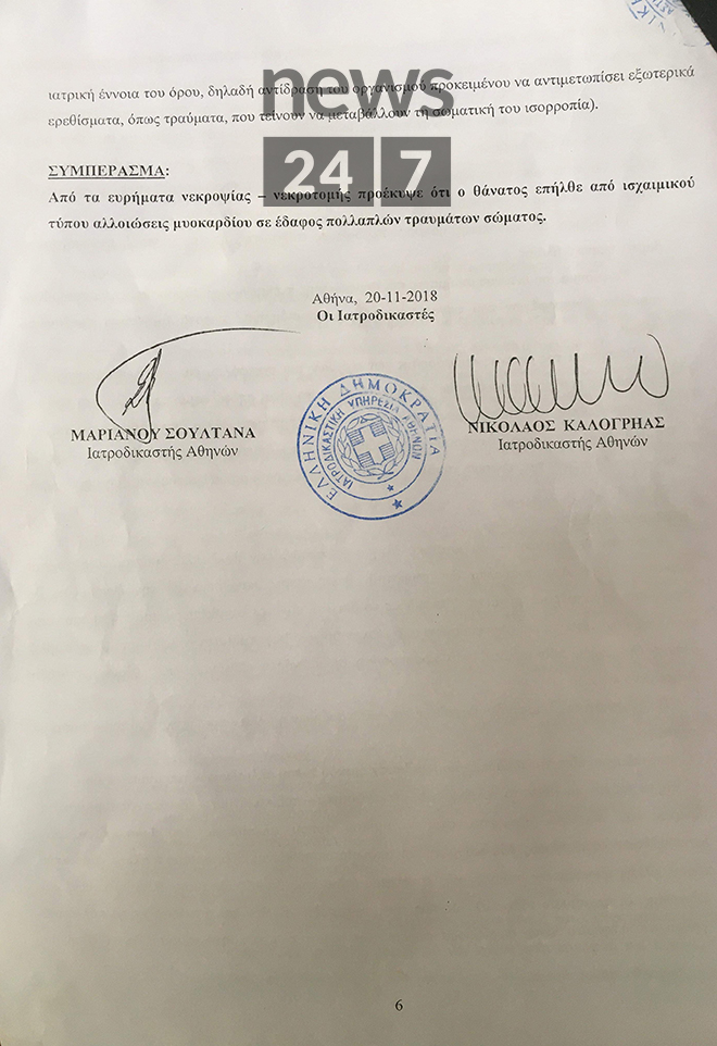 “Τα νεκροτομικά ευρήματα συνδέονται με την πραγματική αιτία θανάτου, τα τραύματα αποτέλεσαν την αιτία για το καρδιακό επεισόδιο, δέχτηκε πολλαπλές πλήξεις. Όλα, σε συνδυασμό με πόνο και αιμορραγία του προκάλεσαν διέγερση, που επέφερε τον θάνατο. Ένα μεγάλο ποσοστό του πληθυσμού παθαίνει κρίσεις πανικού, δεν πεθαίνει”, είπε ο ιατροδικαστής.