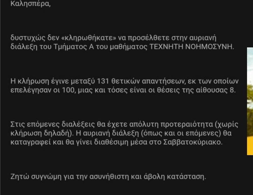 Πρωτοφανές μήνυμα έλαβαν δευτεροετείς φοιτητές του τμήματος Εφαρμοσμένης Πληροφορικής στο ΠΑΜΑΚ στη Θεσσαλονίκη, όπου τους γινόταν γνωστό πως δεν μπορούν να παρακολουθήσουν την διάλεξη του τμήματος Α΄ του μαθήματος «Τεχνητή Νοημοσύνη» επειδή δεν κληρώθηκαν.