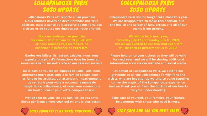 Όπως αναφέρουν σε ανακοίνωσή τους στο site τους: “Είμαστε απογοητευμένοι που προχωράμε σε αυτή την απόφαση, αλλά η υγεία και η ασφάλεια των φανς μας, των καλλιτεχνών και όλων των ομάδων μας, είναι προτεραιότητα”.