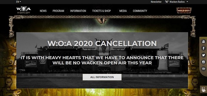 Την ακύρωσή του ανακοίνωσε και το Wacken Open Air, ένα από τα μεγαλύτερα φεστιβάλ μέταλ μουσικής που πραγματοποιείται κάθε χρόνο στη Γερμανία, συγκεντρώνοντας χιλιάδες κόσμου από όλες τις χώρες.