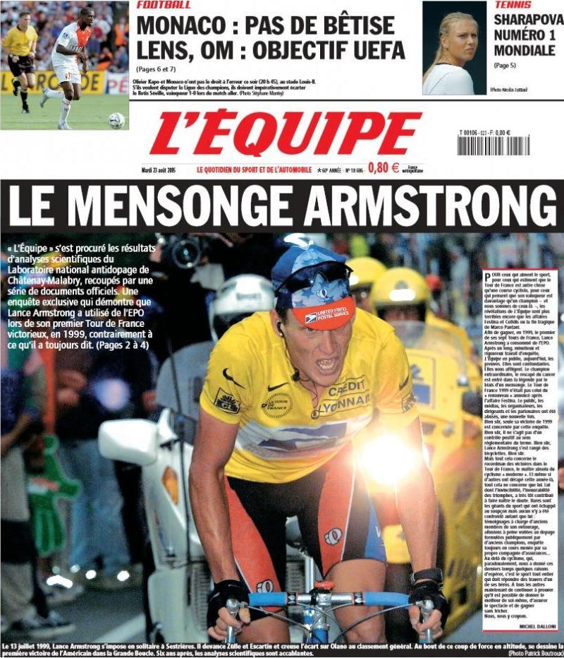 Τα πρώτα σύννεφα είχαν ήδη μαζευτεί πάνω από το Παρίσι, όταν το 2005, μετά από πολύμηνη έρευνα, η L’Équipe δημοσίευσε ότι είχε βρεθεί ερυθροποιητίνη (ΕΠΟ) στα δείγματα των ούρων του Άρμστρονγκ από την πρώτη του νίκη στο Tour. Οι περισσότεροι προσπέρασαν τότε το πρωτοσέλιδο της γαλλικής εφημερίδας με τίτλο “το ψέμα Άρμστρονγκ”, όμως πόσο τυχαίο μπορεί να ήταν το γεγονός ότι ο Τεξανός δε μήνυσε την εφημερίδα; Και εκεί εγείρεται το μεγάλο ερώτημα που τους παίρνει όλους σβάρνα. Πόσο μεγάλη πρέπει να ήταν η υποκρισία για ένα άθλημα, το οποίο έκλεισε τα μάτια του και τα αυτιά του απέναντι σε υποψίες, ενδείξεις και αποδείξεις, σφυρίζοντας προκλητικά αδιάφορα;