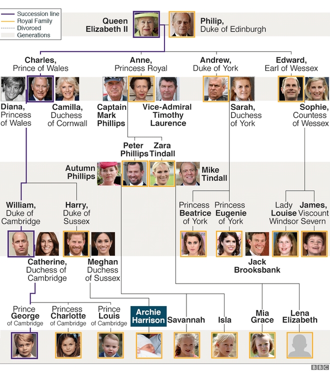 Μετά από την Βασίλισσα Ελισάβετ, σειρά έχει ο γιος της, Κάρολος, ενώ ακολουθεί ο πρωτότοκος γιος του και αδερφός του Χάρι, Πρίγκιπας Ουίλιαμ. Ο Ουίλιαμ και η Κέιτ Μίντλετον απέκτησαν τρία παιδιά, επομένως ακολουθεί ο Πρίγκιπας Τζορτζ, η Πριγκίπισσα Σάρλοτ και ο Πρίγκιπας Λούις.