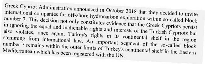 - «Η ελληνοκυπριακή διοίκηση ανακοίνωσε τον Οκτώβριο του 2018 ότι αποφάσισε να προσκαλέσει διεθνείς εταιρείες για την εξερεύνηση υδρογονανθράκων ανοικτής θάλασσας μέσα στο λεγόμενο οικόπεδο 7. Η απόφαση αυτή δεν αποτελεί μόνο απόδειξη ότι οι Ελληνοκύπριοι επιμένουν να αγνοούν τα ίσα και αναφαίρετα δικαιώματα και συμφέροντα των Τουρκοκυπρίων, αλλά παραβιάζει για άλλη μια φορά τα δικαιώματα της Τουρκίας στην ηπειρωτική της υφαλοκρηπίδα στην περιοχή, τα οποία απορρέουν από το διεθνές δίκαιο. Ένα σημαντικό τμήμα του λεγόμενου οικοπέδου αριθμός 7 παραμένει στα εξωτερικά όρια της τουρκικής ηπειρωτικής υφαλοκρηπίδας στην ανατολική Μεσόγειο, η οποία έχει εγγραφεί στον ΟΗΕ» αναφέρουν οι γραπτές θέσεις της Άγκυρας.