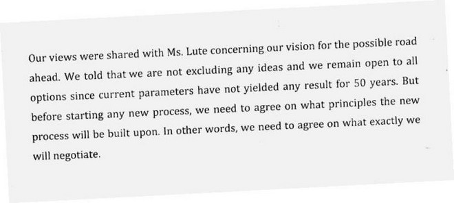 Ειδικότερα, σε σχέση με τη μελλοντική πορεία» οι τουρκικές θέσεις αναφέρουν χαρακτηριστικά: «Ενώ πιστεύουμε ότι είναι καιρός να εργαστούμε σε νέες ιδέες και διαφορετικά μοντέλα, δεν θα δεχθούμε καμία διαδικασία που θα προκαλέσει περαιτέρω απώλεια χρόνου. Είμαστε της άποψης ότι πρώτα και κύρια όλα τα μέρη πρέπει να συμφωνήσουν για το τι θα τύχει διαπραγμάτευσης και πώς θα διεξαχθούν αυτές οι διαπραγματεύσεις». Το έγγραφο της Άγκυρας αναφέρει ακόμη ότι «μοιραστήκαμε τις θέσεις μας με την κ. Λουτ, σε σχέση με το όραμά μας για την πιθανή μελλοντική πορεία. Είπαμε ότι δεν αποκλείουμε καμιά ιδέα και ότι παραμένουμε ανοικτοί σε όλες τις επιλογές, καθώς οι υφιστάμενες παράμετροι δεν απέδωσαν κανένα αποτέλεσμα για 50 χρόνια. Αλλά πριν ξεκινήσουμε μια νέα διαδικασία, θα πρέπει να συμφωνήσουμε επί ποίων αρχών θα οικοδομηθεί η νέα διαδικασία» προσθέτει το τουρκικό έγγραφο, διευκρινίζοντας ότι «με άλλα λόγια θα πρέπει να συμφωνήσουμε τι ακριβώς θα διαπραγματευθούμε».