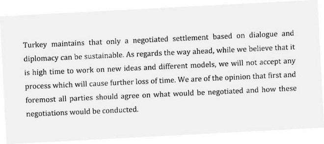 «Νέες ιδέες και διαφορετικά μοντέλα» στο Κυπριακό ζητά διά των γραπτών θέσεων που υπέβαλε προς την Ε.Ε. η Τουρκία. Οι τουρκικές θέσεις αναφέρουν ότι «η Τουρκία υποστηρίζει ότι μόνο μια διευθέτηση μέσω διαπραγματεύσεων, βασισμένη στον διάλογο και στη διπλωματία μπορεί να είναι βιώσιμη.