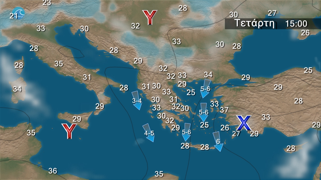 Στην ανατολική Στερεά, την Εύβοια και τις Σποράδες τις πρωινές ώρες βροχές και σποραδικές καταιγίδες, οι οποίες θα είναι κατά τόπους ισχυρές και θα συνοδεύονται από χαλαζοπτώσεις, από το μεσημέρι όμως τα φαινόμενα θα εξασθενήσουν. Στην υπόλοιπη χώρα άστατος καιρός με τοπικές βροχές και καταιγίδες κυρίως το μεσημέρι-απόγευμα στην Πελοπόννησο και την Κρήτη και όμβρους στα ορεινά των υπόλοιπων ηπειρωτικών περιοχών. Οι άνεμοι θα πνέουν από βόρειες διευθύνσεις 3 με 5, στα ανατολικά ηπειρωτικά 5 με 6 και στο Αιγαίο 6 και τοπικά 7 μποφόρ. Η θερμοκρασία δεν θα σημειώσει αξιόλογη μεταβολή.