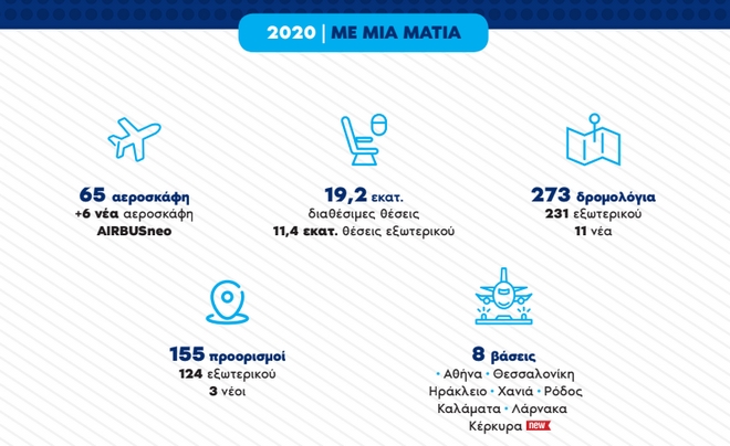 Στο πλαίσιο αυτό, η εταιρεία προσθέτει 11 νέα δρομολόγια στο συνολικό της πρόγραμμα σε διεθνείς προορισμούς από τις βάσεις της Αθήνας, της Θεσσαλονίκης και την νέα βάση της Κέρκυρας. Ταυτόχρονα εντάσσει 3 νέους προορισμούς στο δίκτυό της από Μπέρμινχαμ, Πάφο, Μπιλμπάο. Παράλληλα, σχεδιάζει αύξηση της χωρητικότητας σε επιπλέον 47 δρομολόγια εξωτερικού, προσθέτοντας συνολικά 1,1 εκ. θέσεις στην ετήσια δραστηριότητά της και φτάνοντας έτσι τις 11,4 εκ. θέσεις συνολικά.