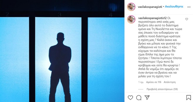 Τότε ο ίδιος αποφάσισε να απαντήσει στα σχόλια στο Instagram, αναφέροντας: “Οι περισσότεροι από εσάς μας βρίζατε όλο αυτό το διάστημα εμένα και τη Νικολέτα και τώρα σας έπιασε τον ενδιαφέρον να μάθετε ποσό διάστημα κράτησε η σχέση μας; Καλά έκανε και βγήκε και μίλησε και φυσικά την ενθάρρυνα να το κάνει!! Της εύχομαι τα καλύτερα και θα είμαι δίπλα της άμα μου το ζητήσει! Τίποτα λιγότερο τίποτα περισσότερο! Εγώ ποτέ δε κρύβομαι και ούτε θα κρυφτώ! Απλά δε νομίζω ότι αρμόζει σε έναν άντρα να βγαίνει και να μιλάει για τη σχέση του!”