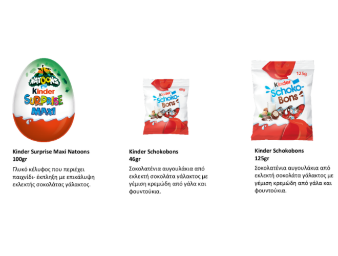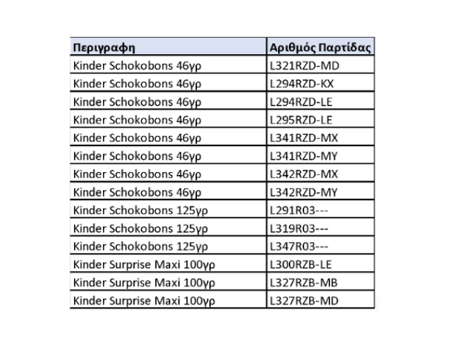 Σαν μέτρο πρόληψης, αποφασίσαμε να ανακαλέσουμε από την ελληνική αγορά τα προϊόντα Kinder Schokobons και Kinder Surprise maxi 100gr με τους κατωτέρω αναφερομένους αριθμούς παρτίδας, που έχουν σαν χώρα παραγωγής το Βέλγιο.