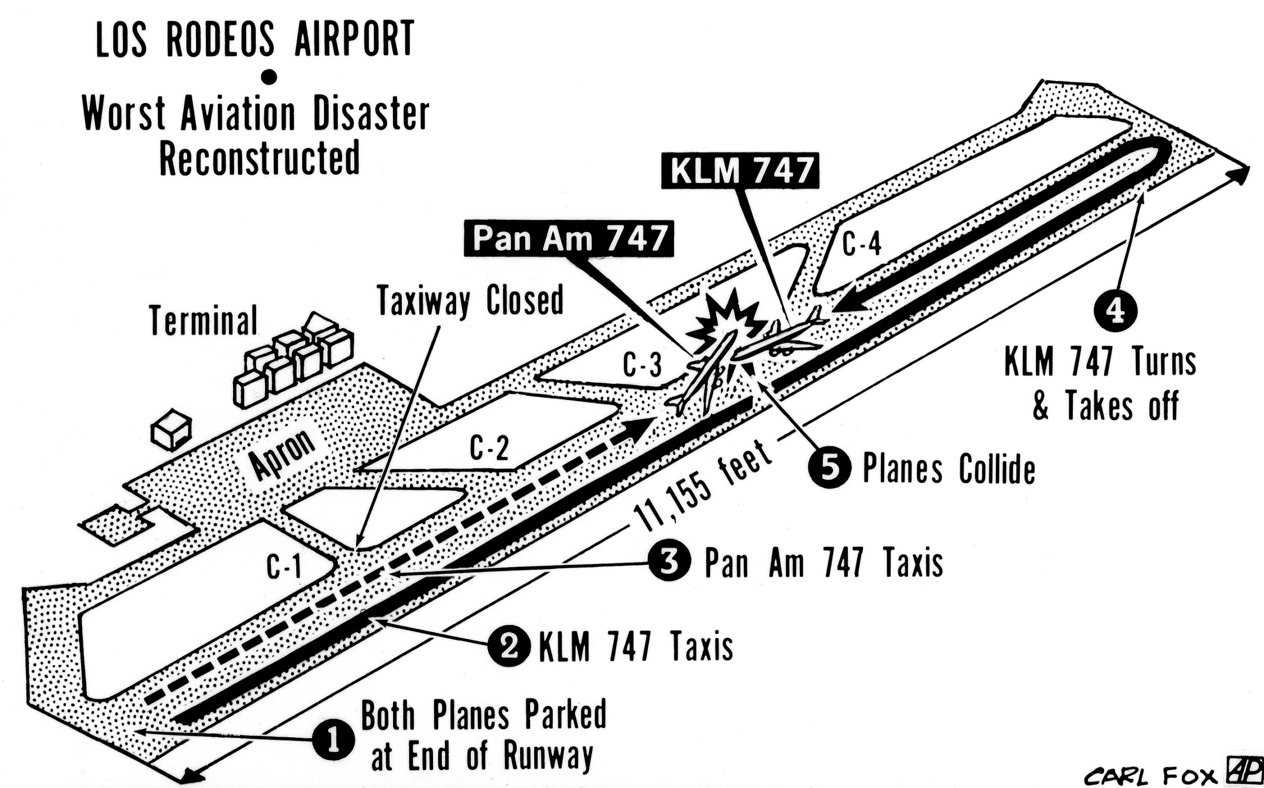 - Η ξαφνική ομίχλη που περιόρισε την ορατότητα, με αποτέλεσμα ο πύργος ελέγχου και τα πληρώματα των δυο Boeing 747, να μην έχουν οπτική επαφή μεταξύ τους.