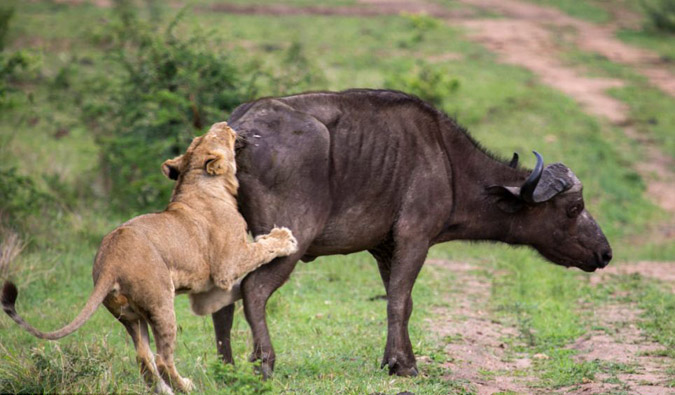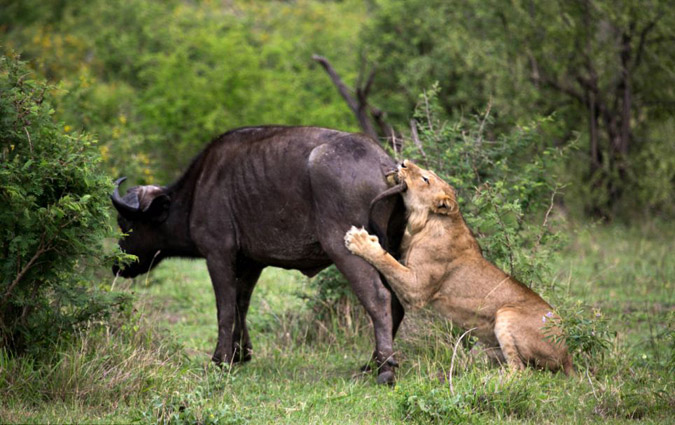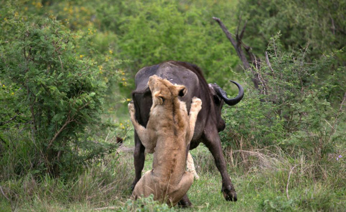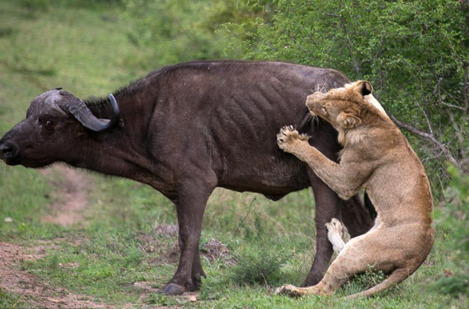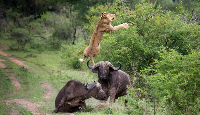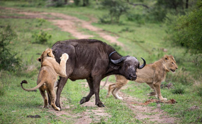 Η μονομαχία ξεκίνησε με αφορμή την επίθεση δυο λιονταριών σε ένα βουβάλι, που έβοσκε ανέμελα. Την ώρα που το πλησίαζαν ένα δεύτερο βουβάλι έσπευσε να βοηθήσει. Κατά τη διάρκεια της μάχης για την επιβίωση, εκτόξευσαν το ένα λιοντάρι σχεδόν πέντε μέτρα.