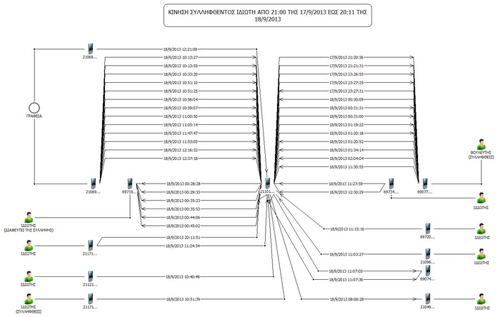 Από τα σχεδιαγράμματα που έρχονται στη δημοσιότητα από το υπουργείο Δημόσιας Τάξης φαίνεται πως ένας από τους συλληφθέντες εμφανίζεται να έχει επικοινωνήσει 14 φορές με έναν από τους έξι βουλευτές οι οποίοι έχουν συλληφθεί και ισάριθμες φορές με τα κεντρικά γραφεία της Χρυσής Αυγής. Μάλιστα εμφανίζεται ο σταθερός αυτός αριθμός να ανήκει στον Νίκο Μιχαλολιάκο.